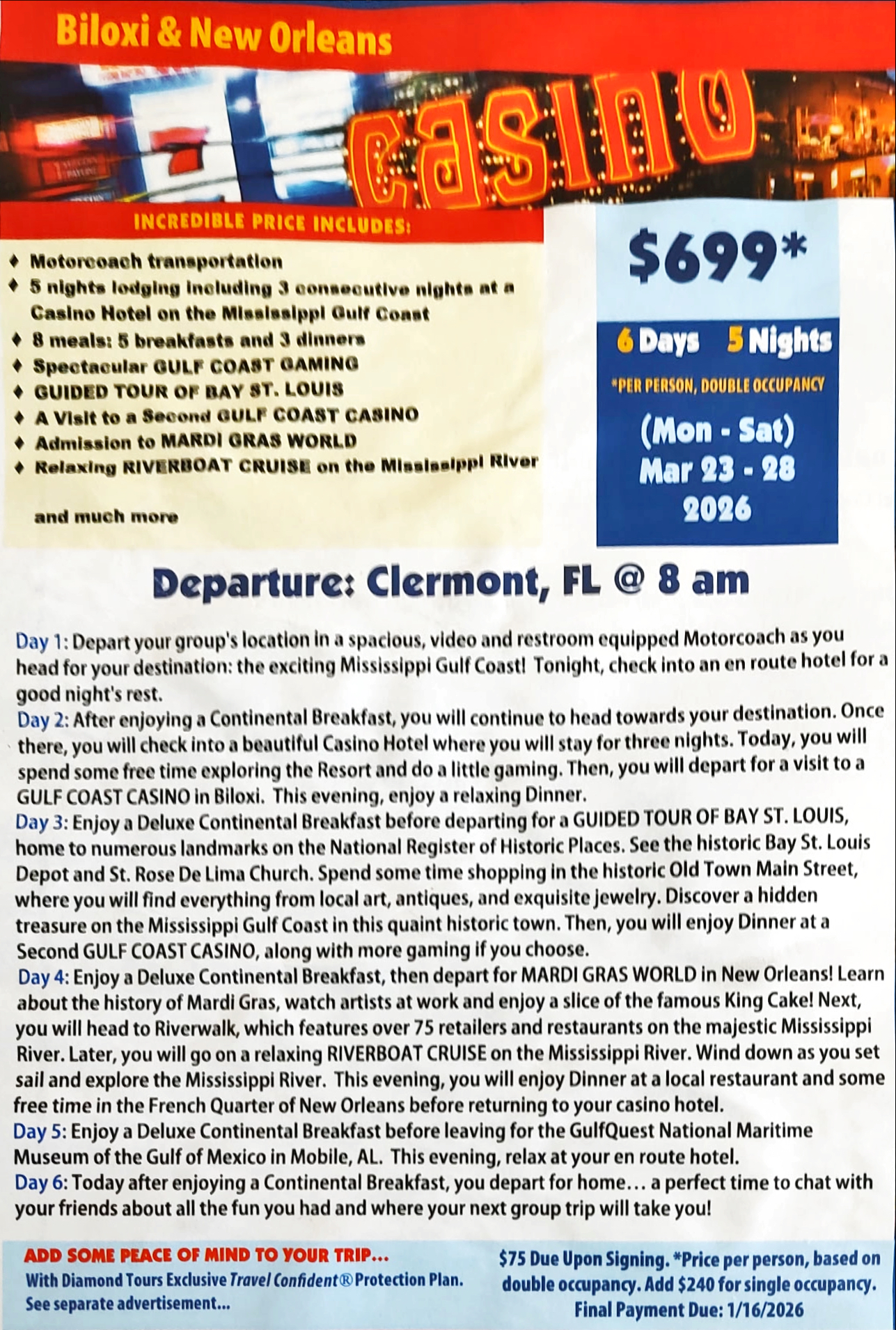 Please see the individual trip flyers for more details about each of these trips. All checks are to be payable to Small World Tours. Drop off your check at the Outdoor Resorts EE weekly ticket sales to allow for an accurate head count for each bus.